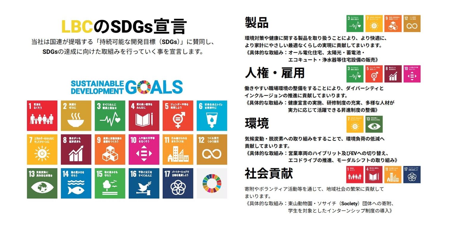 INFOMATION 会社情報 MESSAGE 代表挨拶 家族の笑顔と日々の安心を守るお家のセカンドオピニオンへ 住まいは、家族が日々を重ね、人生の大切な時間を育む場所です。 弊社のサービス「住まいリフォーム」は、その大切な住空間を、より快適で安全なものに保つためのパートナーでありたいと考えています。 近年、お家の多様化や自然災害の増加、物価高の上昇、社会環境の変化などにより、住まいを取り巻くリスクは年々複雑化しています。 そうした中で、安心して長く暮らせる住まいを実現するには、施工後も末永く「守り続ける仕組み」が必要です。 弊社は、住まいに関するあらゆるリスクやお困りごとに備えることで、お客様の安心・安全な生活をサポートすることを使命としています。 単なる「一時対応」や「修理」にとどまらず、「予防」と「見守り」の視点を大切にしたメンテナンスサービスを通じて、住まいに関する不安を未然に防ぐ。 そして、困ったときにすぐ頼れる、身近で信頼できるパートナーとして、常にお客様に寄り添う存在でありたいと考えています。 お客様にとってお家は大きな資産であり、長く付き合っていくものです。だからこそ、私たちは「一度きりの関係」ではなく、「末永く続く信頼関係」を築いていくことを大切にしています。 これからも「住まいリフォーム」というサービスを通じて、確かな知識と経験、そして人に寄り添う姿勢を持って、より良いサービスの提供に努めてまいります。 安心と信頼をかたちに。皆さまの住まいの未来を、私たちがしっかりと支えていけるパートナーとして邁進して参ります。 代表取締役社長 酒井 雄基 INFOMATION 会社概要 運営会社 株式会社LBC 代表取締役社長 酒井 雄基 住所 〒460-0017 愛知県名古屋市中区松原三丁目2番8号MATSUBARA328ビル7階 TEL/FAX 052-291-4606/052-291-4170 宅地建物取引業免許 愛知県知事(1)第25517号 業務内容 住宅設備機器メンテナンスサービス リフォーム全般 水まわりリフォーム ハウスクリーニング 太陽光パネル・蓄電池の販売・施工 住宅ローン見直し相談サービス 東海支店 〒485-0046 愛知県小牧市堀の内3-14 堀の内ビル3B 関東支店 〒337-0015 埼玉県さいたま市見沼区大字蓮沼936番地53 ※倉庫 〒454-0867 愛知県名古屋市中川区広田町3丁目59番地 資本金 10,000,000円 創業 2019年9月 設立 2021年4年 従業員数 45名 全体人数 202名(業務委託•アルバイト含む) 取引先銀行 三井住友銀行 あいち銀行 名古屋銀行 愛知信用金庫 顧問税理士 税理士法人コスモス 顧問社労士 武内労務事務所 顧問弁護士 名古屋ユナイテッド・パートナーズ法律事務所 森田美由紀 関連企業 LBCホールディングス株式会社 株式会社LBC 株式会社はやぶさ住設 INFOMATION 会社概要 運営会社 株式会社LBC 代表取締役社長 酒井 雄基 住所 〒460-0017 愛知県名古屋市中村区松原三丁目2番8号 MATSUBARA328ビル7階 TEL/FAX 052-291-4606 / 052-291-4170 宅地建物取引業免許 愛知県知事(1)第25517号 業務内容 ・住宅設備機器メンテナンスサービス ・リフォーム全般 ・水まわりリフォーム ・ハウスクリーニング ・太陽光パネル・蓄電池の販売・施工 ・住宅ローン見直し相談サービス 東海支部 〒485-0046 愛知県小牧市堀の内3-14 堀の内ビル3B 関東支部 〒338-0015 埼玉県さいたま市 見沼区大字蓮沼936番地53 ※倉庫 〒454-0867 愛知県名古屋市中川区 広田町3丁目59番地 資本金 10,000,000円 創業 2019年9月 設立 2021年4月 従業員数 45人 全体人数 202名(業務委託・アルバイト含む) 取引先銀行 三井住友銀行 あいち銀行 名古屋銀行 愛知信用金庫 顧問税理士 税理士法人コスモス 顧問社労士 武内労務事務所 顧問弁護士 名古屋ユナイテッド・パートナーズ法律事務所 森田 美由紀 関連企業 LBCホールディングス株式会社 株式会社LBC 株式会社はやぶさ住設 スポンサー Hida Traning Lab様 A.C.Compare様 PLUMONE様 東山動植物園様 主要取扱メーカー AERA 支店・営業エリア 東海エリア 本社 〒460-0017 愛知県名古屋市中区松原三丁目2番8号MATSUBARA328ビル7階 支店 〒485-0046 愛知県小牧市堀の内3-14 堀の内ビル3B ※倉庫 〒454-0867 愛知県名古屋市中川区 広田町3丁目59番地 関東エリア 支店 〒337-0015 埼玉県さいたま市 見沼区大字蓮沼936番地53